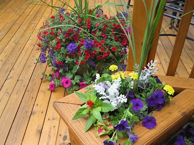 Between my slow computer and sometimes not feeling good, I sure do get behind on these blogs. The Donald and I went to Schwartz's Greenhouse yesterday and grabbed all their bargain flowers for our deck now that it is nicely stained. They close the end of June and there were still lots of flowers left. What fun, because it wasn't crowded and we could pick and choose carefully. They were in great shape too. So here is a picture gallery of our finished project. We did it first thing in the morning yesterday before it got too hot. You gotta love those purple wave petunias!!